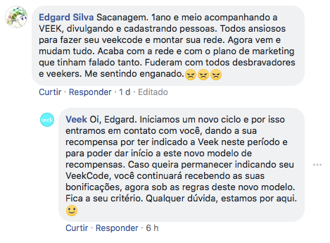 A Veek disse que está iniciando um novo ciclo e caso Edgard queira permanecer indicando seu VeekCode, continuará recebendo bonificações, mas sob as regras de um novo modelo.