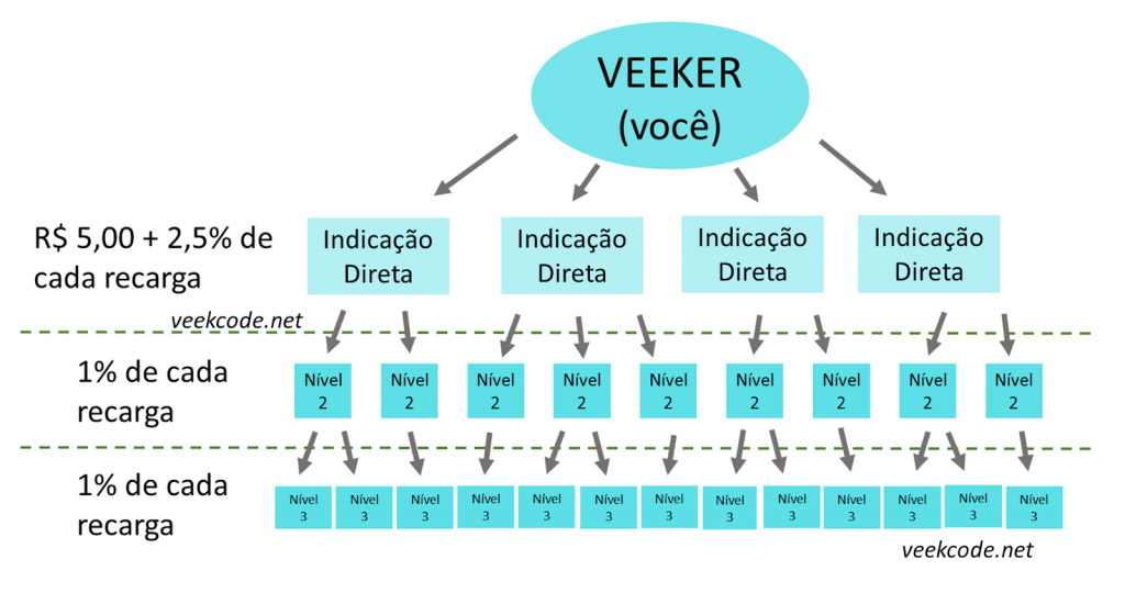 No modelo anterior, além de ganhar quando seu indicado comprava o chip, o Veeker ganhava 2,5% do valor de cada recarga realizada por seu indicado direto.