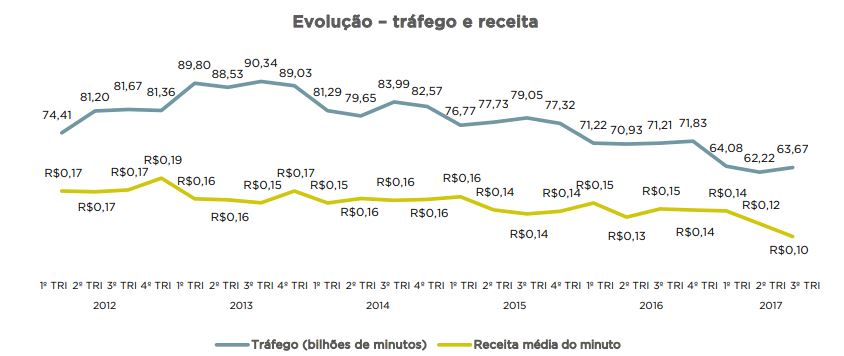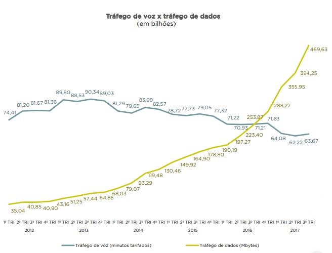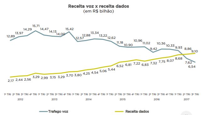 Em uma comparação anual, a queda foi de 10,2% no consumo de voz do 3º trimestre de 2016 para o mesmo período em 2017, enquanto o aumento no consumo de dados foi de 54%.