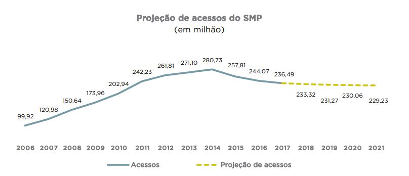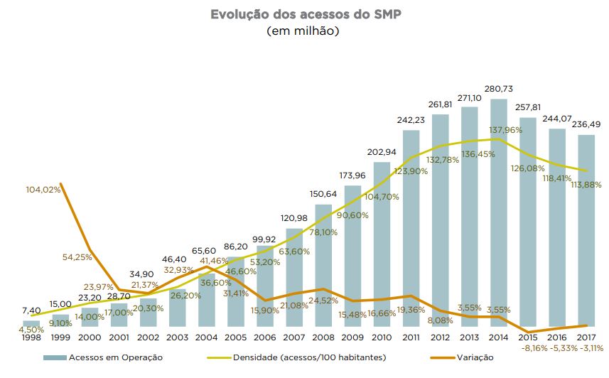 Os acessos de telefonia móvel (Serviço Móvel Pessoal – SMP) em 2017 podem até ser mais de 30 vezes superiores ao de 1998, mas o relatório da Anatel mostra que, ao encerrar o ano com 236,5 milhões de acessos, o Brasil registrou uma queda de 3,1% no setor em relação ao ano de 2016.
