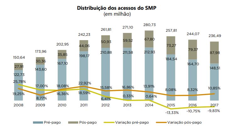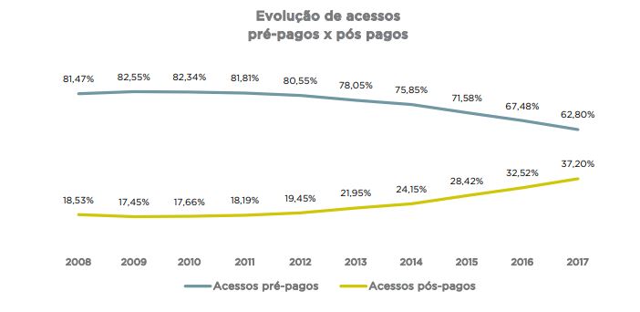 Quanto á distribuição dos planos em pré-pago e pós-pago, a tendência de queda em um, e aumento em outro, também continuou em 2017, principalmente pela procura de mais dados, que, segundo a Anatel, são encontrados em planos pós-pagos.