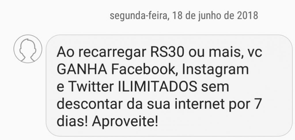 A TIM disparou, nesta segunda-feira (18), um SMS para vários clientes do pré-pago anunciando uma nova oferta de recarga. De acordo com a mensagem, ao recarregar R$ 30, o cliente ganha o acesso ilimitado às redes sociais Facebook, Instagram e Twitter, sem nenhum custo adicional.