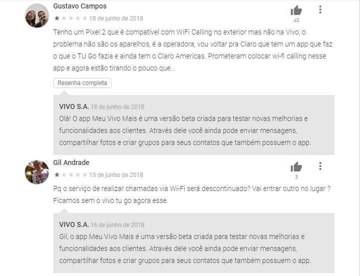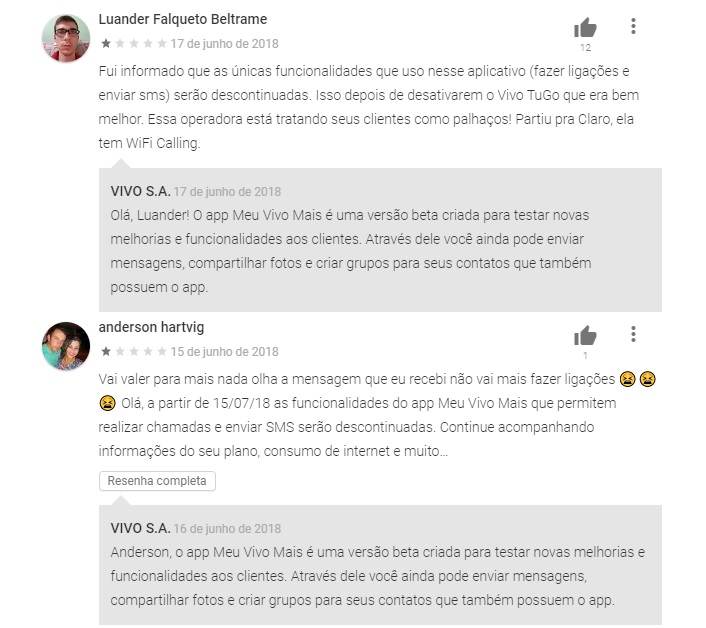 Nas avaliações do aplicativo na Play Store, os clientes se mostram insatisfeitos com a medida tomada pela Vivo.