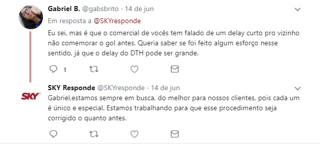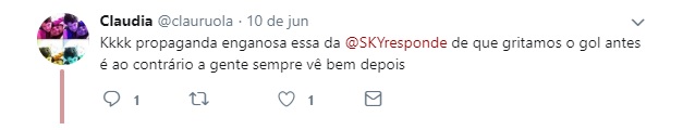 O perfil @gabsbrito perguntou para a SKY, no Twitter, se houve algum esforço no sentido de reduzir o delay, já que o comercial diz que quem tem SKY comemora o gol antes.