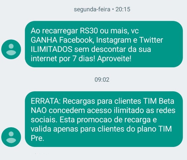 O SMS foi disparado pela operadora nesta última segunda-feira (18) para vários clientes do TIM beta. Acontece que, na manhã desta quarta-feira (20), dois dias depois, a TIM enviou um SMS informando uma errata e esclarecendo: “Recargas para clientes TIM Beta NÃO concedem acesso ilimitado às redes sociais”.