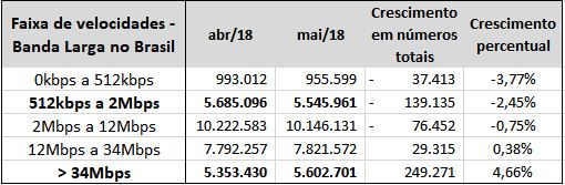 Os dados também mostram que as velocidades de 12Mbps para baixo vêm caindo. De abril para maio, fora a ultra banda larga, apenas as faixas entre 12Mbps a 34Mbps cresceram, em um total percentual de 0,38%, representado por quase 30 mil novas conexões.