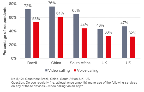 As vídeo chamadas nos apps passam a ser mais populares do que as de voz (VoIP) nos Estados Unidos, no Reino Unido, na África do Sul, na China e no Brasil.