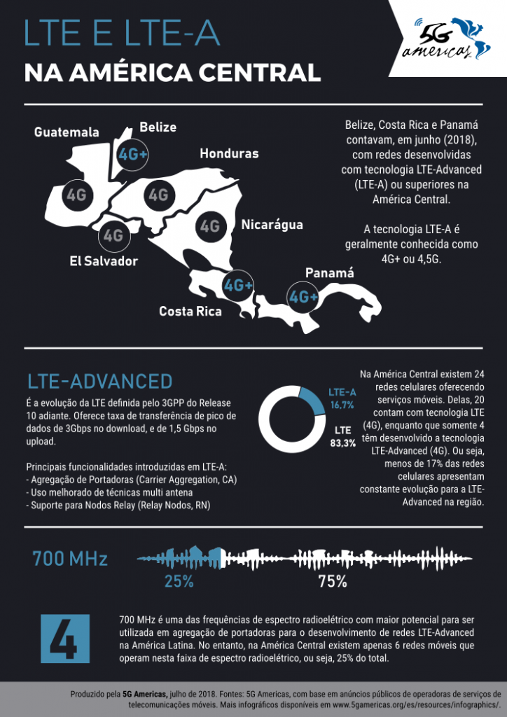 A região fechou o primeiro semestre de 2018 com 24 redes móveis, que oferecem serviços em Belize, Costa Rica, El Salvador, Guatemala, Honduras, Nicarágua e Panamá. Mas apenas quatro dessas redes foram implantadas em LTE-A em Belize, Costa Rica e Panamá, representando 16,7% do total das redes móveis do continente.