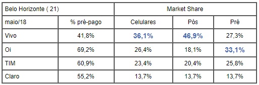 A Oi, líder em pré-pago, vem perdendo market share. O pré-pago representa 55,2% do total de celulares do DDD 31.