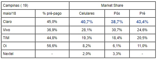 A Claro é a líder em market share no DDD 19, que abrange a região de Campinas, com 38,7% em fevereiro de 2017.