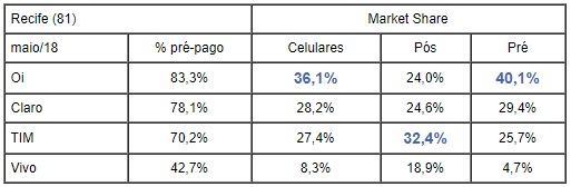 A Oi se mantem na liderança na área local 81, que abrange a região metropolitana de Recife. Ela é a líder no pré-pago que representa 74,8% dos celulares desse DDD.
