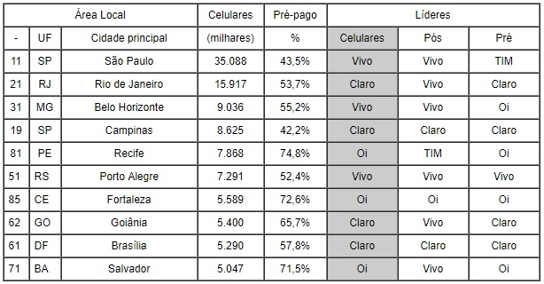 Entre esses dez DDDs, a Vivo lidera no pós-pago em seis deles, a Claro lidera no total de celulares em quatro e a Claro e a Oi lideram no pré-pago em quatro desses DDDs, conforme pode ser observado na tabela abaixo.