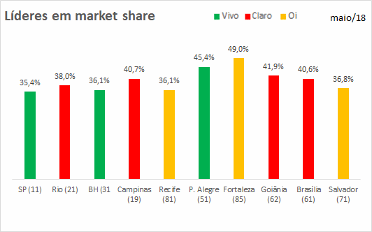 A TIM é líder em market share em 16, a Claro em 13 e a Oi em 6.