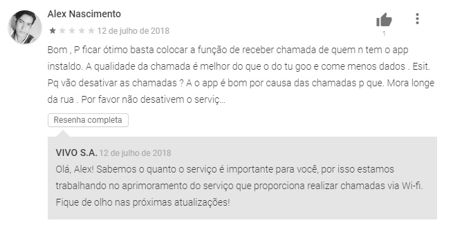 Nesta quinta-feira (12), o cliente Alex Nascimento questionou a Vivo do motivo pelo qual a operadora iria desativar as chamadas. A pergunta foi realizada nos comentários das avaliações do app na Play Store.
