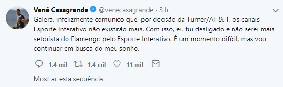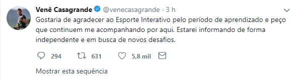 O repórter Venê Casagrande se manifestou sobre o assunto em seu perfil pessoal no Twitter, comunicando seu desligamento.