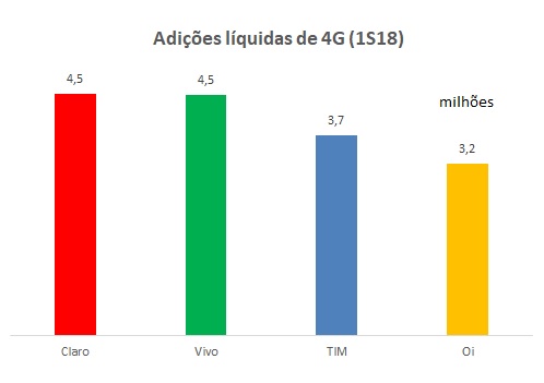 A Vivo também lidera em market share de 4G no Brasil, seguida pela TIM. Mas Claro e Oi estão recuperando terreno e ganharam market share nesse primeiro semestre.