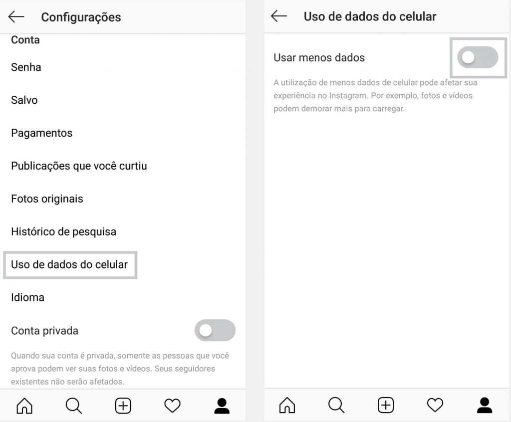 Para ativá-la, é preciso abrir seu perfil no Instagram e clicar no ícone superior direito, de “Configurações”. Depois, basta selecionar “Uso de dados do celular” e ativar a opção “Usar menos dados”.