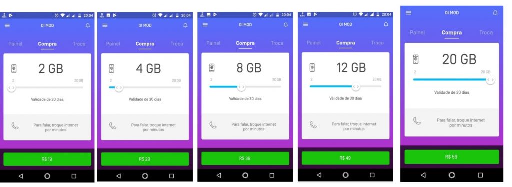O leitor Leandro Pedrosa, cliente e usuário do Oi Mod, enviou, ao Minha Operadora, algumas imagens do app em seu celular, que comprovam os novos preços, de cinco pacotes disponíveis. Ficaram assim: