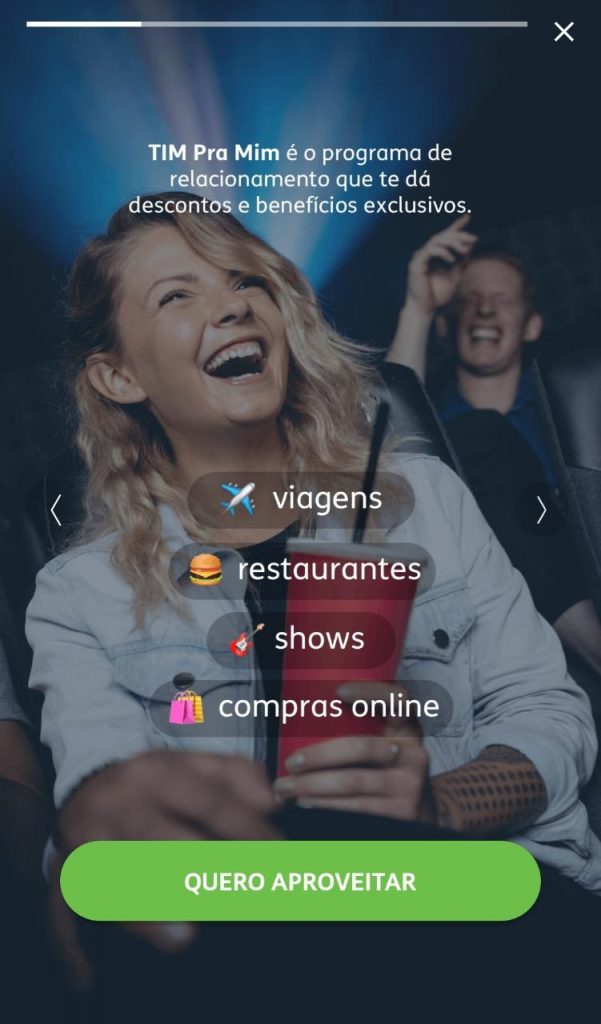 Ao clicar em “Quero Aproveitar”, a chamada inserida pela TIM na imagem, o usuário é direcionado para a página do TIM Pra Mim, onde pode ver os descontos em viagens, restaurantes, shows e compras on-line que consegue fazer através do programa.