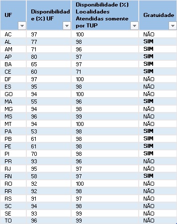 A tabela abaixo apresenta os percentuais de disponibilidade de orelhões da concessionária Oi verificados pela Anatel em 30 de agosto.