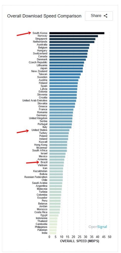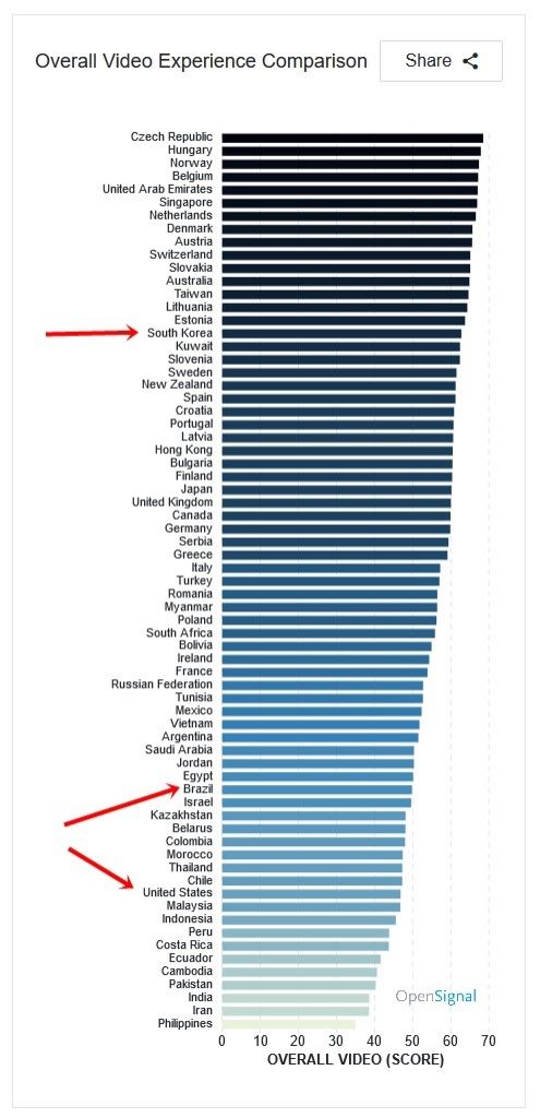 Um exemplo é a Coreia do Sul que reina suprema no topo do gráfico de conexões mais rápida. No entanto, ficou com o 16º lugar no ranking de streaming de vídeo.
