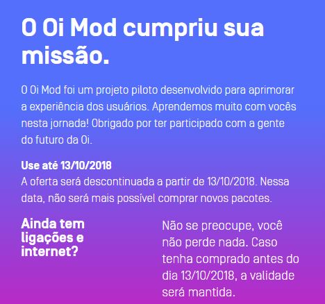 Os clientes do Oi Mod podem usar o plano até o dia 13 de outubro, data em que a oferta irá parar de funcionar e ninguém mais poderá comprar novos pacotes.