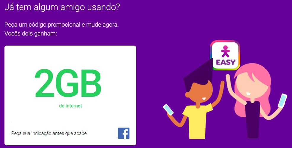A inexistência de validade serve tanto para o saldo de internet quanto de minutos, e foi uma das grandes novidades anunciadas com a reformulação do Easy, que aconteceu em julho deste ano. Na ocasião, cada cliente que utilizasse o código do amigo – além da própria pessoa que indicou – recebia 1.000 diárias para usar o WhatsApp ilimitado.