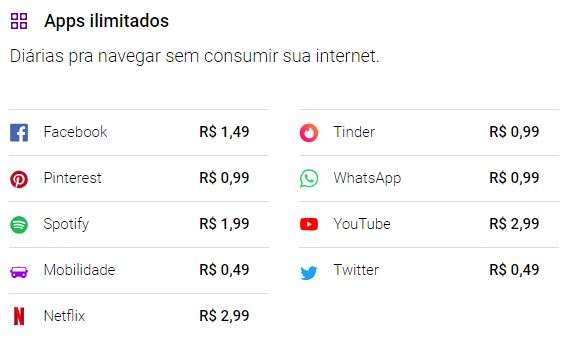 As diárias são mais uma novidade da Vivo no plano digital, e permitem que o cliente escolha comprar pacotes ilimitados de seus aplicativos favoritos, caso não queira gastar do seu pacote de dados. Para usar o WhatsApp, por exemplo, o custo é de R$ 0,99 pela diária ilimitada do app. O Facebook custa R$ 1,49, a Netflix R$ 4,99, Twitter e Mobilidade (Waze, Easy e Cabify) custam R$ 0,49, e assim por diante. Veja a lista completa: