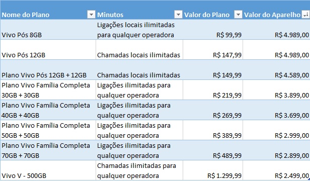 Abaixo, você confere o preço do aparelho para cada tipo de plano Vivo.