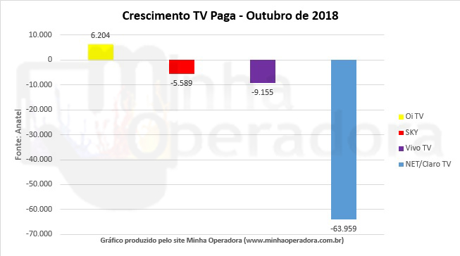 Somente a Oi conseguiu crescer no segmento de TV por assinatura de setembro para outubro de 2018. As demais operadoras perderam clientes, conforme o último levantamento da Agência Nacional de Telecomunicações (Anatel).