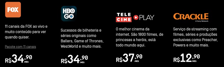 O cliente também tem os conteúdos do Coleção Oi, Noggin (aplicativo do canal Nick Jr), WatchESPN e Discovery Kids ON incluídos no plano. Caso deseje, os serviços de streaming Crackle, Telecine Play, HBO Go e FOX+ podem ser contratados separadamente. A vantagem é não precisar de uma assinatura da Oi TV para ter acesso ao conteúdo.