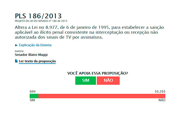 De acordo com a coluna do crítico de TV Ricardo Feltrin, no UOL, há uma forte mobilização de quem compactua com o esquema para que o projeto de lei que torna crime a interceptação ou recepção não autorizado de TV por assinatura.