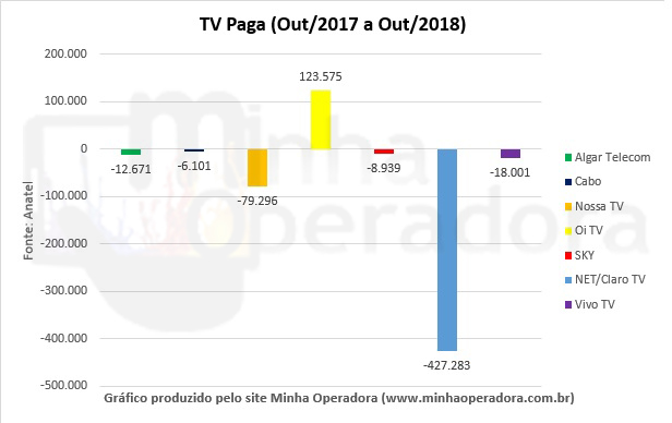Entre as grandes operadoras, a NET/Claro TV foi a que mais perdeu clientes de outubro de 2017 a outubro de 2018, tendo -427.283 assinaturas canceladas, uma redução de -4,65% em sua base de clientes.