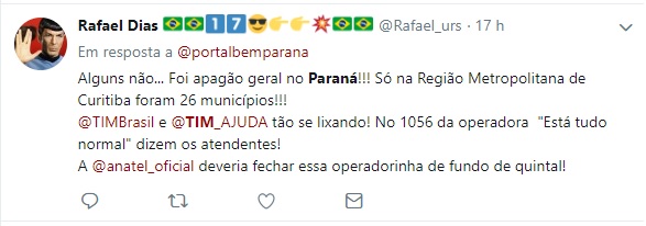 “A TIM pede desculpas aos seus clientes do Paraná e que foram impactados, na tarde deste domingo (25), por uma falha de rede que resultou na intermitência dos serviços de voz e dados. A operadora já restabeleceu o funcionamento dos serviços”, disse a operadora em nota à imprensa.
