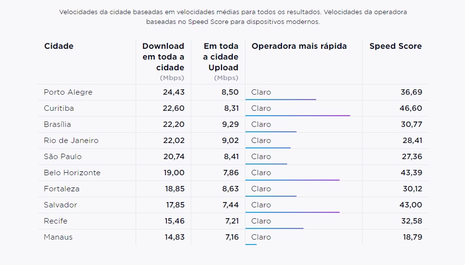 São Paulo, a cidade mais densamente povoada do Brasil, ocupa o quinto lugar, com uma média de 20,74 Mbps.