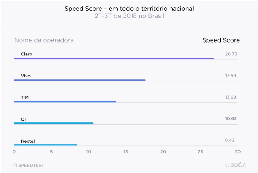 Os dados de Speedtest Intelligence revelam que a Claro foi a operadora mais rápida do Brasil durante o segundo e terceiro trimestre de 2018, alcançando um Speed Score de 26,75 em dispositivos modernos.