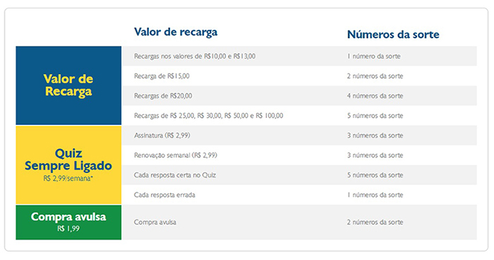 A quantidade de números da sorte que o cliente receberá dependerá do valor da recarga.