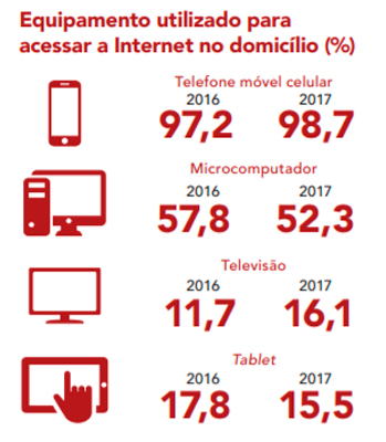 O celular também se destaca entre os dispositivos utilizados no domicílio para o acesso à internet. Confira abaixo uma imagem que revela o percentual de uso entre 2016 e 2017.