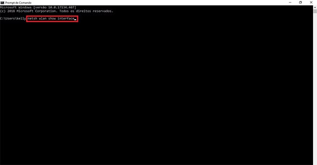 Assim que o “prompt de comando” abrir, entre com o comando: netsh wlan show interface.