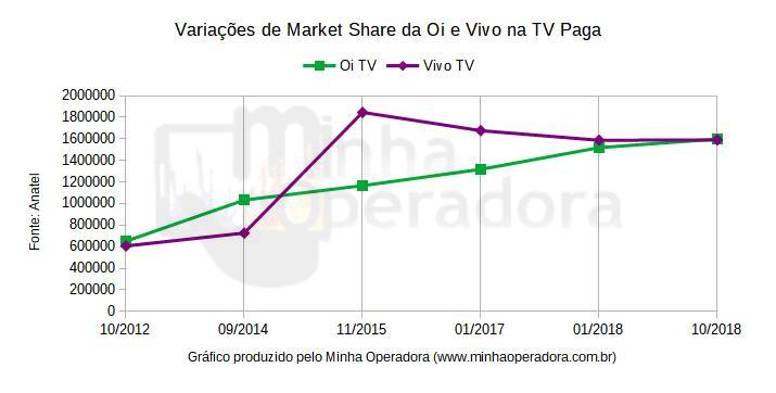 A primeira vez que a Oi TV ultrapassou a Vivo em número de assinantes foi no mês de outubro de 2012, quando a operadora atingiu 651.382 clientes, enquanto a Vivo TV – principalmente por ter uma área de atuação restrita apenas ao estado de São Paulo – estava com apenas 606.700 usuários.