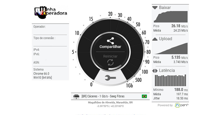 A plataforma de medição consegue identificar de forma precisa a taxa de velocidade de download (recebimento de arquivos), upload (envio de arquivos) e de latência (atraso que uma informação leva para sair de um ponto e chegar ao destino).