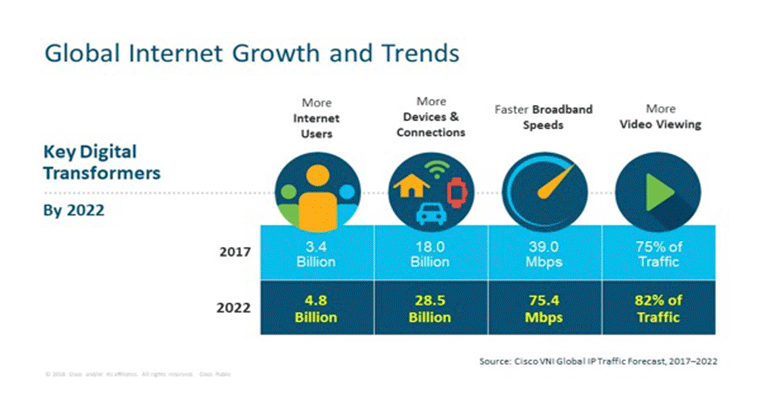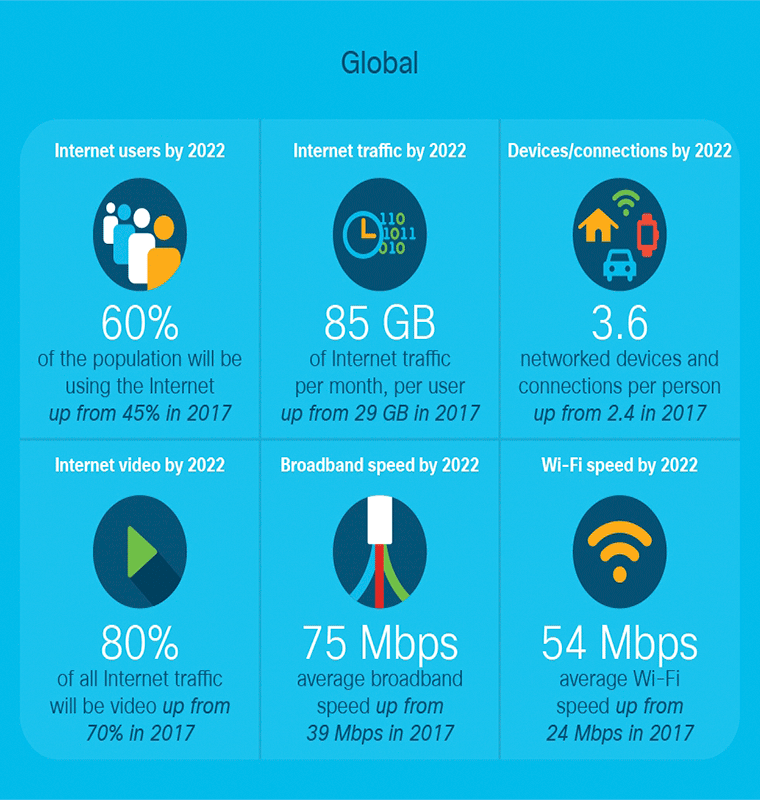 A Cisco diz que atividades relacionadas ao entretenimento serão responsáveis por 85% do trafego da rede em 2020. Outro dado bem interessante é sobre o aumento da base de pessoas conectadas à internet. Em 2017 a Cisco informou que a internet tinha 3,84 bilhões de usuários ao redor do mundo, em 2020 serão 4,8 bilhões!