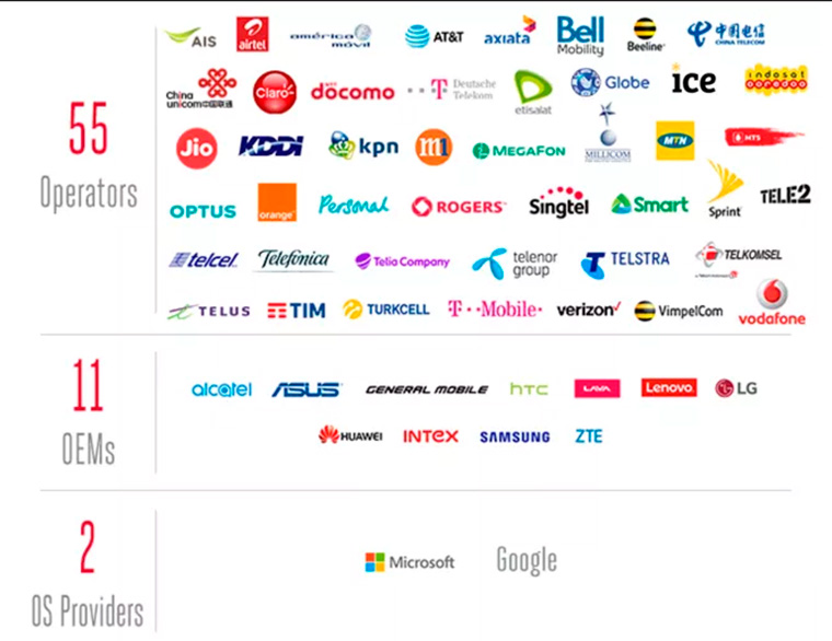 Essa relação de ganho de mercado do RCS depende do apoio de operadoras, fabricantes de aparelhos e companhias responsáveis pelo desenvolvimento dos sistemas operacionais. A lista de apoiadores inclui 55 operadoras, 11 fabricantes de smartphones e 2 desenvolvedoras de sistema.