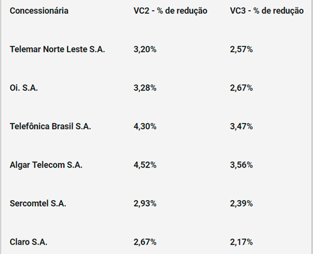 “Nas tarifas VC1, aplicadas nas ligações locais de telefone fixo para móvel, a redução média será de 7,75%, nas VC2, que abrangem localidades com os mesmos primeiros dígitos de código de área (do DDD 21 para o 27, por exemplo), a diminuição média será de 3,48% e nas ligações VC3, entre localidades que possuem os primeiros dígitos do código de área diferentes (do DDD 52 para o 71, por exemplo), a redução média será de 2,81,%. Os novos valores devem ser aplicados a partir de 25 de fevereiro próximo.”