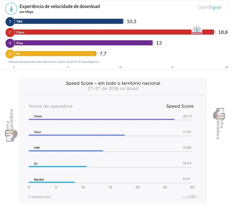 O serviço Open Signal também atesta que a Claro tem a maior velocidade média de download na internet móvel brasileira. De acordo com as 7.158.392.598 mensurações que o aplicativo captou em 395.814 aparelhos celulares de setembro a novembro do ano passado, a experiência geral (somando 3G e 4G), deixou a Claro na liderança com 18,8 Mbps de média. A Vivo fica no segundo lugar (13 Mbps), seguida pela TIM (10,3 Mbps) e Oi (7,7 Mbps).
