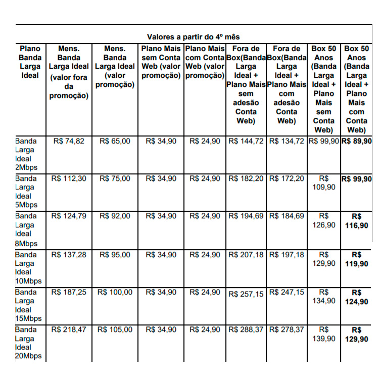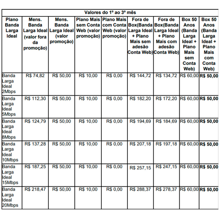 Durante os 3 primeiros meses o valor de todas as opções de planos – de 2 Mbps a 20 Mbps, será R$ 50, em referência ao quinquagésimo aniversário da Sercomtel.