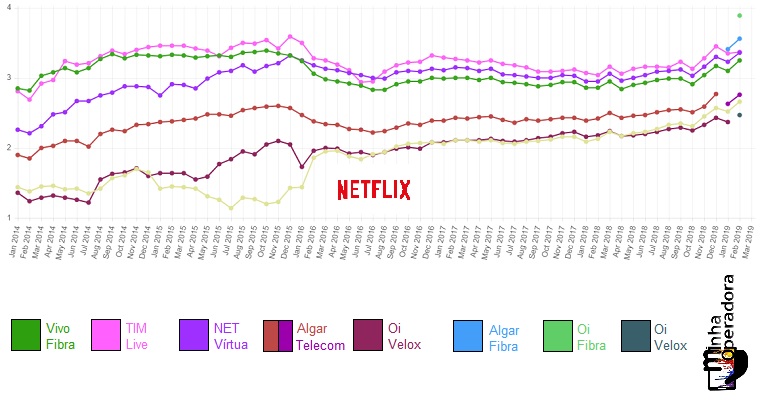 | Gráfico mostra a variação de velocidade das operadoras de internet fixa que são analisadas pela Netflix desde janeiro de 2014. |