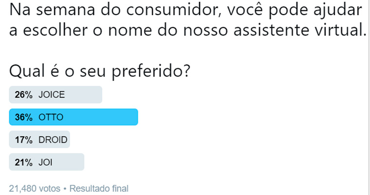 No início dessa semana a operadora Oi abriu no Twiter uma enquete para que as pessoas pudessem determinar qual seria o nome do seu assistente virtual que já foi utilizado em mais de 1 milhão de atendimentos. Essa iniciativa da Oi fez parte de uma ação da Semana do Consumidor.