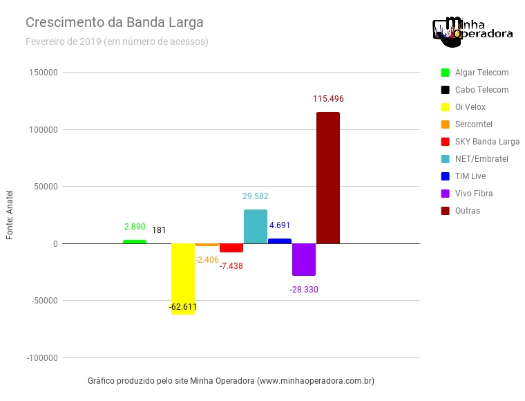 As operadoras locais – quando unidas – formaram o grande destaque do segundo mês do ano de 2019. Foram adicionados 115.496 novos usuários legalizados, o que representou um aumento de 1,77% em relação a janeiro. Junto dos pequenos provedores, as operadoras NET Vírtua/Embratel (+29.582), TIM Live (+4.691), Algar Telecom (+2.890) e Cabo Telecom (+181) também ganharam clientes e engordaram os seus respectivos market shares.