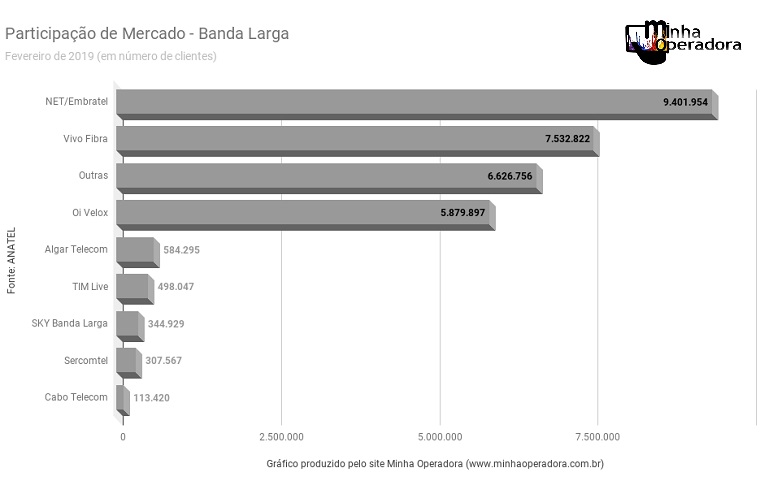 O grupo formado pelas empresas NET/Embratel segue sendo o líder em clientes, com mais de 9,4 milhões de acessos. Veja no ranking abaixo quantos clientes cada uma das principais operadoras possui no Brasil: